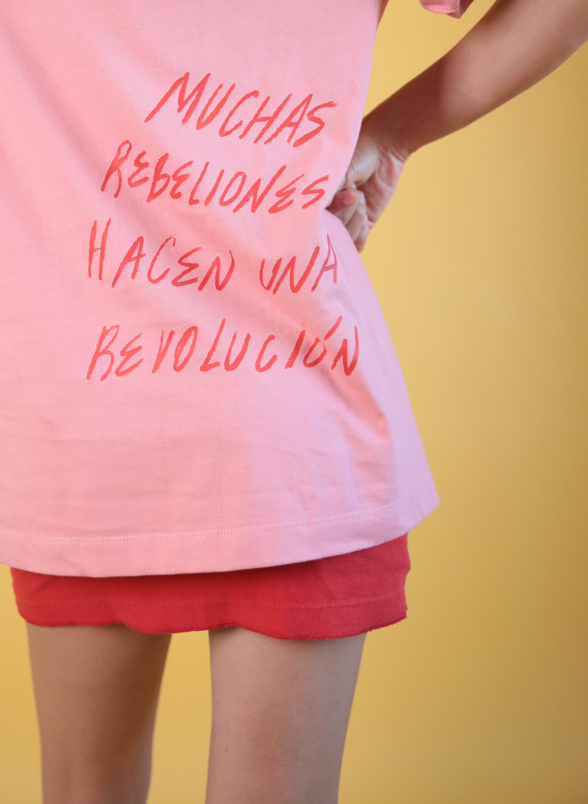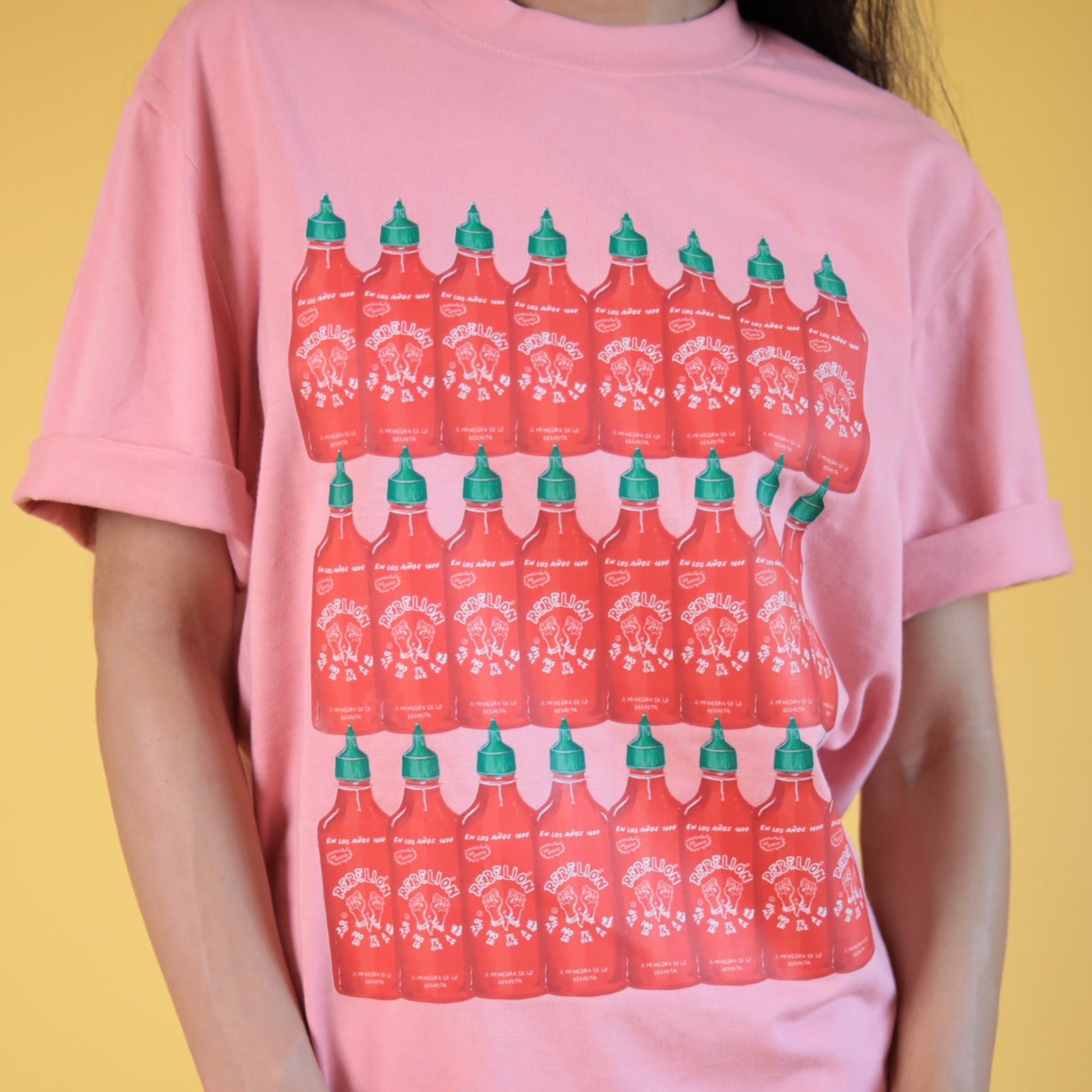 Las sirachas de esta camiseta son de la canción Rebelión del Joe Arroyo y en la parte de atrás se lee: Muchas rebeliones hacen una revolución. También disponible en color blanco